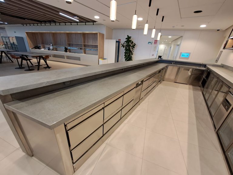 Además, hemos incluido un buffet empotrado realizado en Dekton Danae ingletado, de 800 x 100 cm, y cuatro encimeras de medidas adicionales, todas en Dekton Danae, con específicas (570 x 90 cm, 630 x 90 cm, 500 x 90 cm y 400 x 90 centímetros).