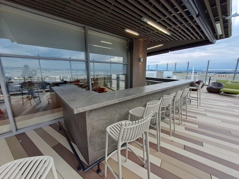 Entre las piezas más destacadas se encuentra una barra interior, elaborada en Dekton Soke, con acabado ingletado y un diseño en forma de ‘U’, cuyas dimensiones alcanzan los 610, 330 y 720 x 65 cm.