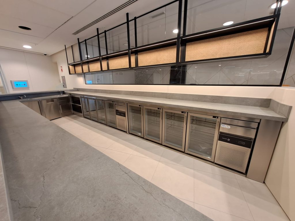Además, hemos incluido un buffet empotrado realizado en Dekton Danae ingletado, de 800 x 100 cm, y cuatro encimeras de medidas adicionales, todas en Dekton Danae, con específicas (570 x 90 cm, 630 x 90 cm, 500 x 90 cm y 400 x 90 centímetros).